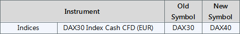 If you are holding an open position overnight on 10th December 2021 before changes implemented, the symbol of your order will be updated to DAX40 on 13th December 2021. The changes will only impact the symbol renamed. The product specifications will remain unchanged and this will not affect your open positions or close any of your open positions.